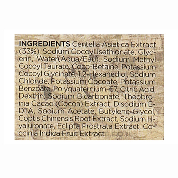 عصاره سنتلا آسیاتیکا، سدیم کوکویل ایزتیونات، گلیسیرین، آب تصفیه شده، سدیم متیل کوکوئیل تاورات، کوکو بتائین، پتاسیم کوکویل گلیسینات، 1،2-هگزان دیول، کلرید سدیم، کوکوات پتاسیم، بنزوات پتاسیم بنزواتریک دی اکسترن، Potassium Benzoate-6, Potassium Benzoat-6, Potassium Benzoat-6, Potassium Cocoyl Glycinate, بی کربنات سدیم، عصاره کاکائو، دی سدیم EDTA، استات سدیم، بوتیلن گلیکول، عصاره ریشه Coptis Chinensis، سدیم هیالورونات، Eclipta Extact، عصاره میوه Coccinia Indica